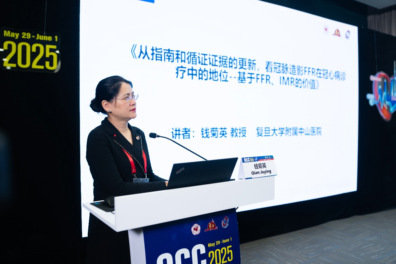 在主旨演講環(huán)節(jié),錢菊英教授進(jìn)行了主題為《從指南和循證證據(jù)的更新,看冠脈造影FFR 在冠心病診療中的地位--基于 FFR、IMR 的價(jià)值》的主旨演講。她指出:“冠狀動脈血流受心外膜冠脈和心肌內(nèi)微循環(huán)影響,過去單純評估心外膜冠狀動脈狹窄程度存在局限。隨著2024 ESC指南對于慢性冠狀動脈綜合征(CCS)定義的變更,我們需要重新審視冠心病發(fā)病機(jī)制,積極推動冠心病傳統(tǒng)診療模式的轉(zhuǎn)變:從單純‘心外膜’冠脈功能學(xué)評估,到‘心外膜+微循環(huán)’冠脈功能學(xué)全面評估,從缺血轉(zhuǎn)向動脈粥樣硬化性冠狀動脈疾病。”
