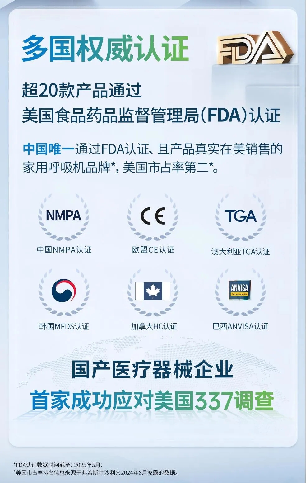 事實上,瑞邁特的全球化布局啟動得很早,在2008年就取得了歐盟CE認(rèn)證,并2012年獲得美國FDA認(rèn)證,成為目前僅有的一家在美國銷售的中國家用呼吸機(jī)企業(yè),并在2023年美國市場銷售占有率達(dá)到第二位,在全球這一廣闊空間中,獲得歐美等發(fā)達(dá)國家市場的廣泛認(rèn)可,產(chǎn)品技術(shù)力得到進(jìn)一步淬煉。