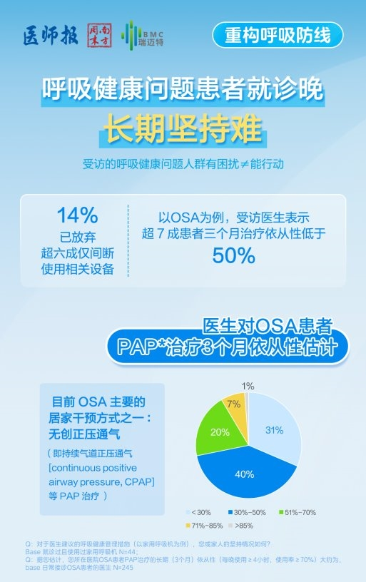 針對《報告》揭示的呼吸健康管理的臨床診療痛點,BMC 瑞邁特首席營銷官陳瀟表示:“調研數(shù)據(jù)不僅展現(xiàn)了患者的迫切需求,更凸顯了我們義不容辭的行業(yè)責任?;诒敬螆蟾娼沂镜呐R床需求,我們已經從提升大眾疾病發(fā)現(xiàn)率、提升治療依從性和加速呼吸健康管理閉環(huán)落地三大維度發(fā)力,推動呼吸健康管理從‘看到’真正走向‘做到’。”
